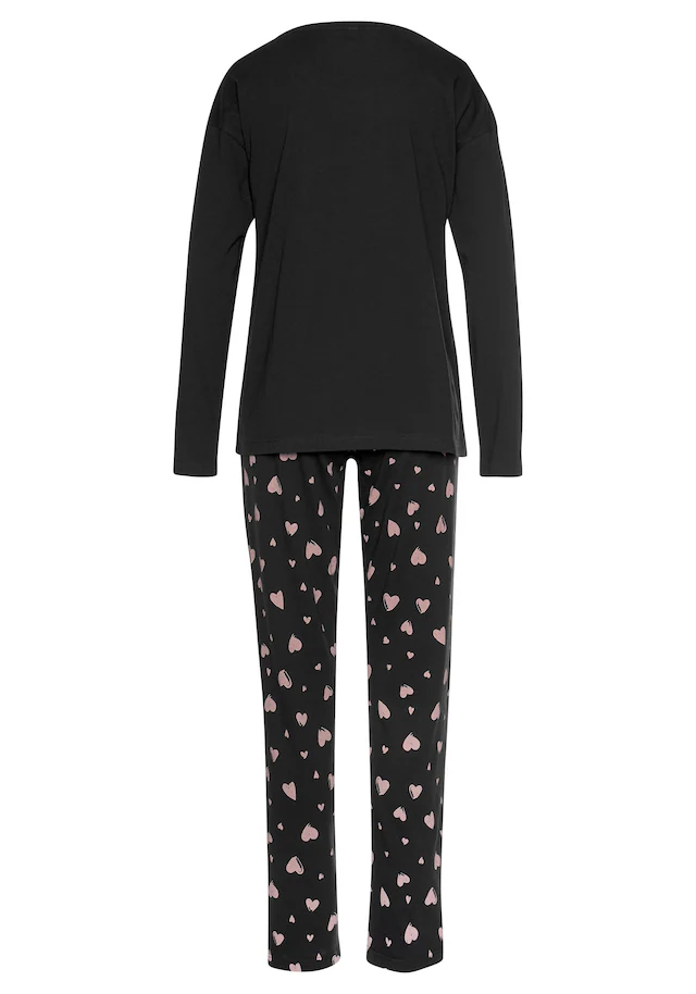 Pyjama von Vivance Dreams mit Herzchenmuster. Unifarbenes Langarmshirt mit Rundhalssausschnitt und Frontdruck. Gemusterte Hose mit elastischem Tunnelzugbund. Obermaterial: 100% Baumwolle (unterstützt Cotton made in Africa)