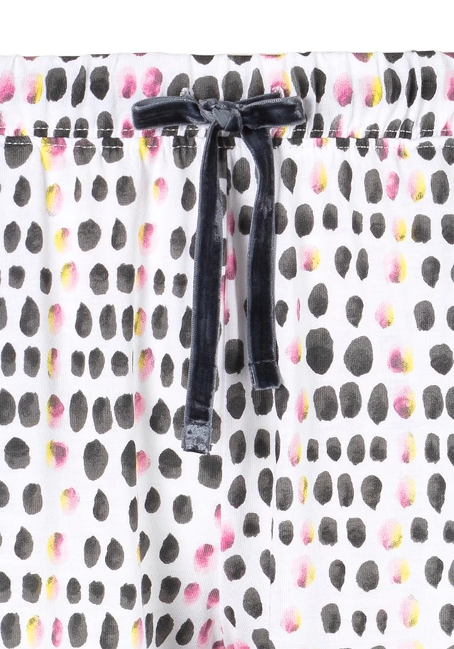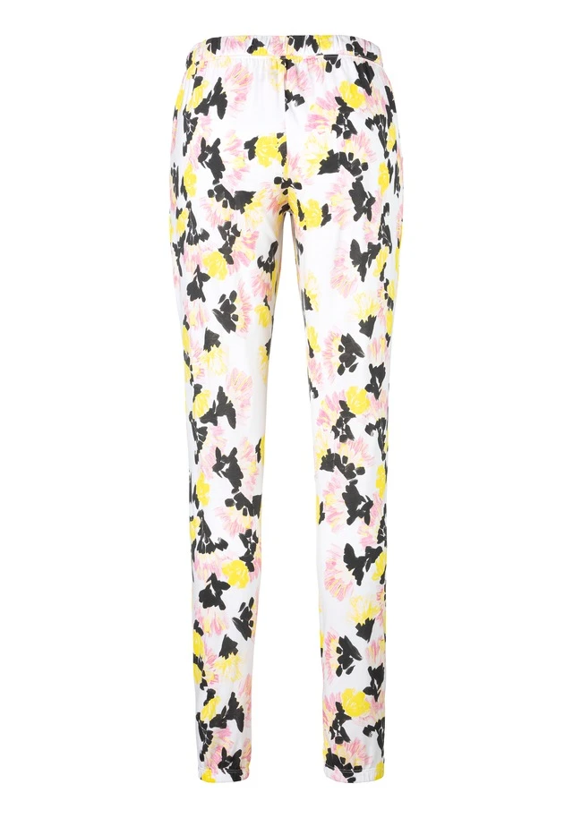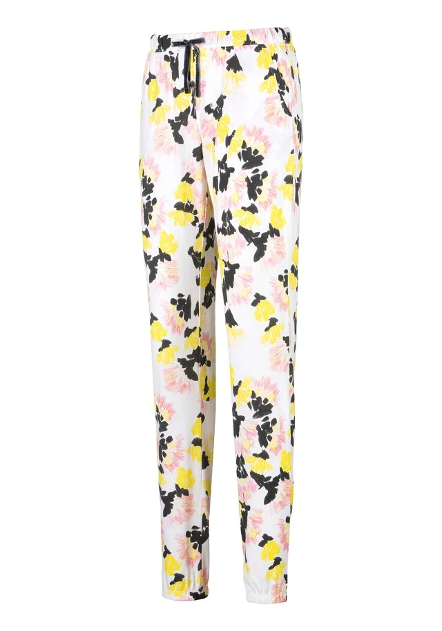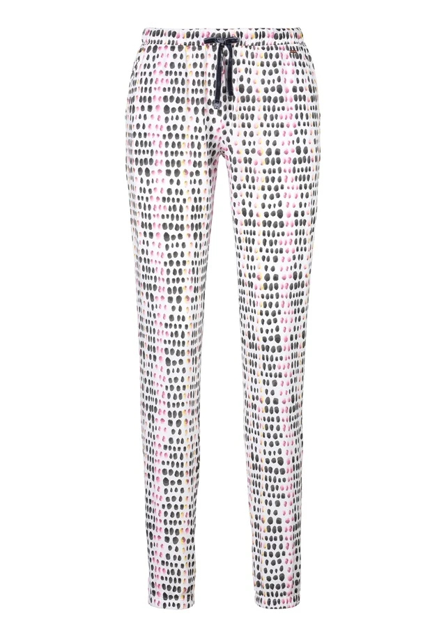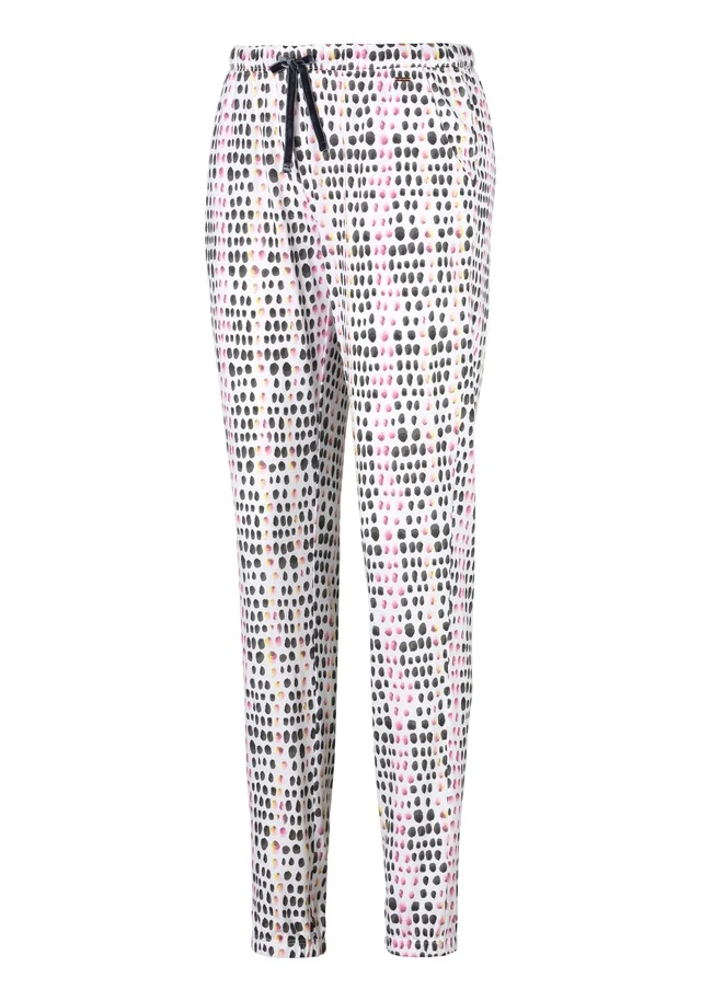 Lange Pyjamahose mit allover Print und seitlichen Eingriffstaschen. Elastischer Gummibund mit Tunnelzug und Stretchbündchen am Beinabschluss. Angenehme Baumwoll-Viskosequalität.