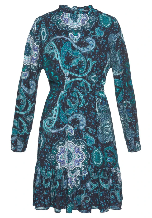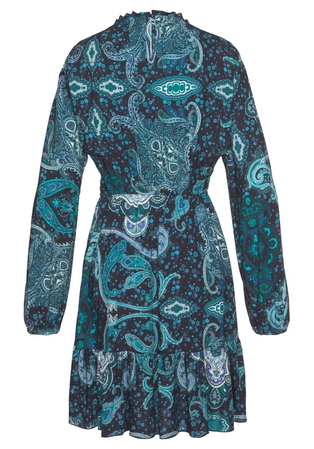 Druckkleid mit Alloverprint von Vivance. Hoher Halsausschnitt mit Rüschenkante. Volant am Rockteil. Schlitz mit Knopfverschluss im Nacken. Lange Ärmel mit Gummibund. Gummizug in der Taille. Trageangenehme Qualität.