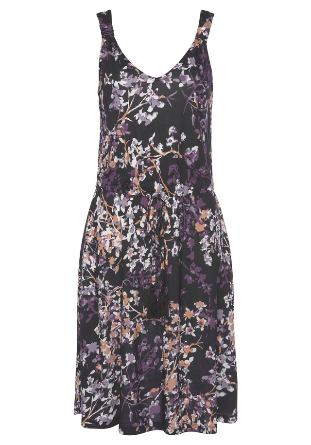 Charmantes Midikleid von Vivance. Floraler Alloverprint. Jedes Teil ein Unikat. Tiefer V-Ausschnitt. Cut-out am Rücken. Breite Träger mit Knotendetails. Gummizug in der Taille mit Kordel und Quasten. Leicht ausgestellter Rockteil. Weiche Jerseyqualität.