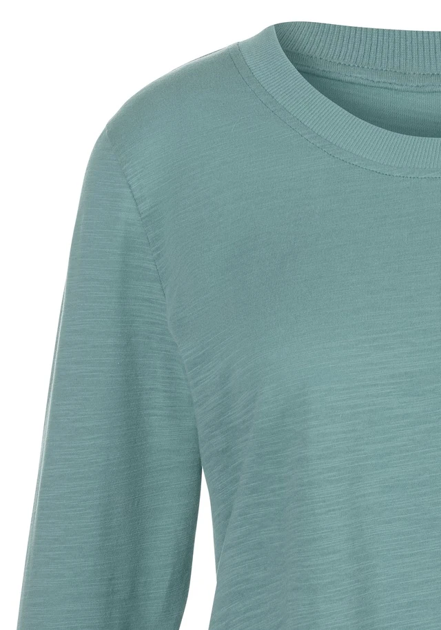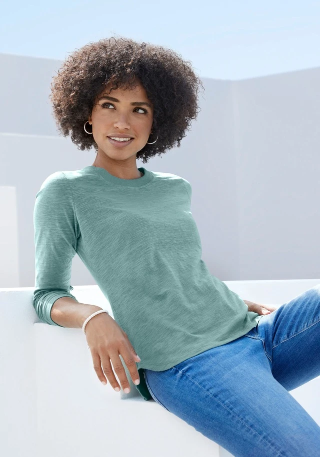 - Breite Rippbündchen an Halsausschnitt und Ärmeln