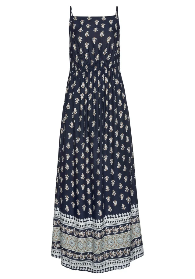Hübsches Maxikleid von Vivance mit Alloverprint. Oberteil mit geradem Ausschnitt und verstellbaren Spaghettiträgern. Verträumter Bordürendruck für einen femininen Look. Taillierte Form durch Gummizug. Perfekt für heiße Sommertage. Rocklänge ca. 104 cm. Nachhaltige, gewebte Qualität aus 100% Viskose.