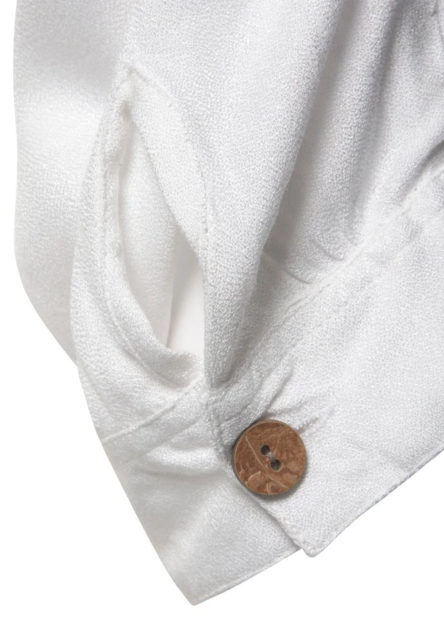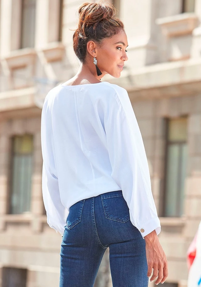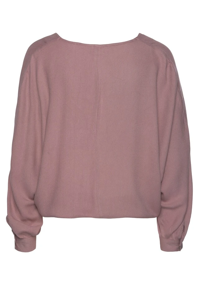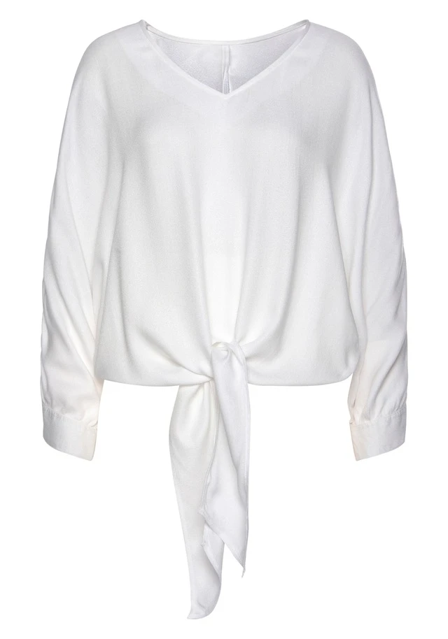 Bluse von VIVANCE mit V-Ausschnitt. Vorn am Saum mit Öffnung und 2 Bändern zum Knoten. Weite, lange Ärmel mit knöpfbarer Manschette. Länge ca. 56 cm. Strukturierte Webware aus 100% Viskose.