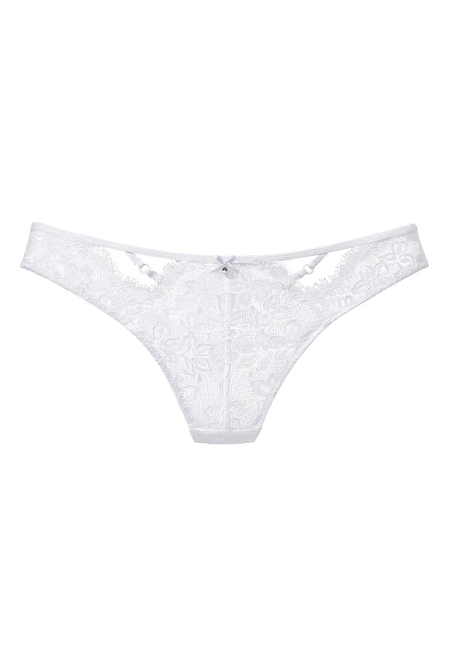 Femininer String aus dezent transparenter Spitze in blumiger Optik. Dessous mit feiner Zierschleife und Glitzeraccessoire in der vorderen Mitte. Hohe Beinausschnitte für eine verführerische Optik. Mit eingearbeitetem Baumwollzwickel. Passende BH’s aus der gleichen Serie erhältlich. Obermaterial: 90% Polyamid, 10% Elasthan.